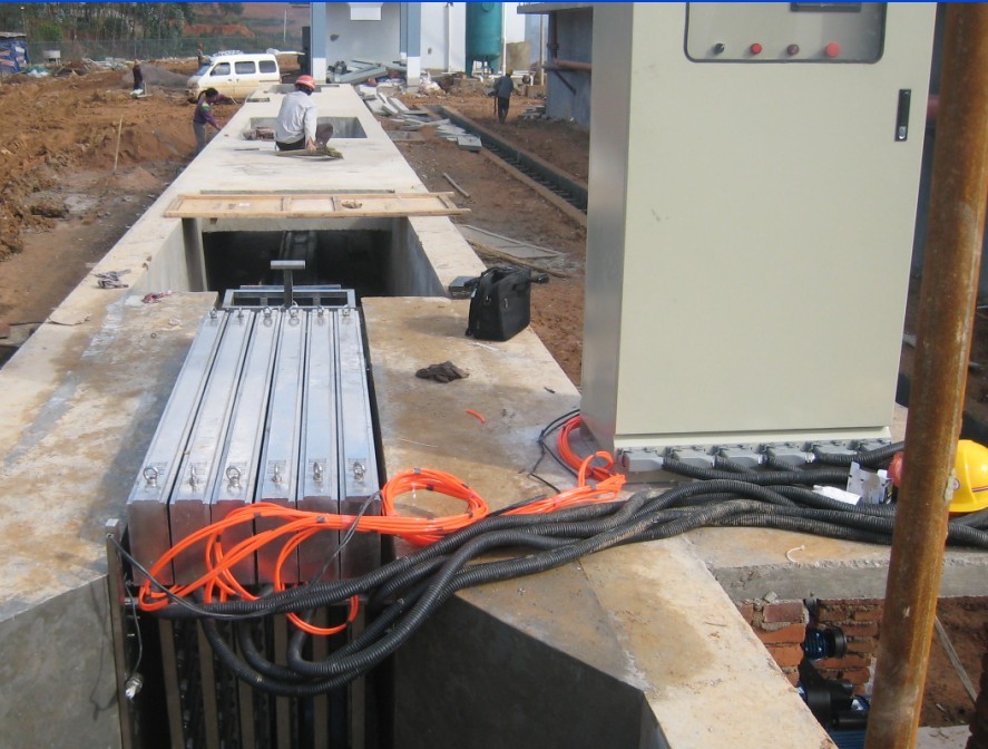 電子鎮(zhèn)流器模塊與跨明渠接線箱相連,接線箱配電受中央控制柜輸送給每個紫外消毒模塊的電源。